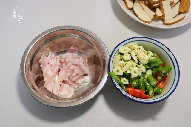 2,另外再切一些青红辣椒,辣椒根据自己的吃辣能力选择。准备点大蒜切片,很提香。五花肉不用多,一小块就好,切片。
