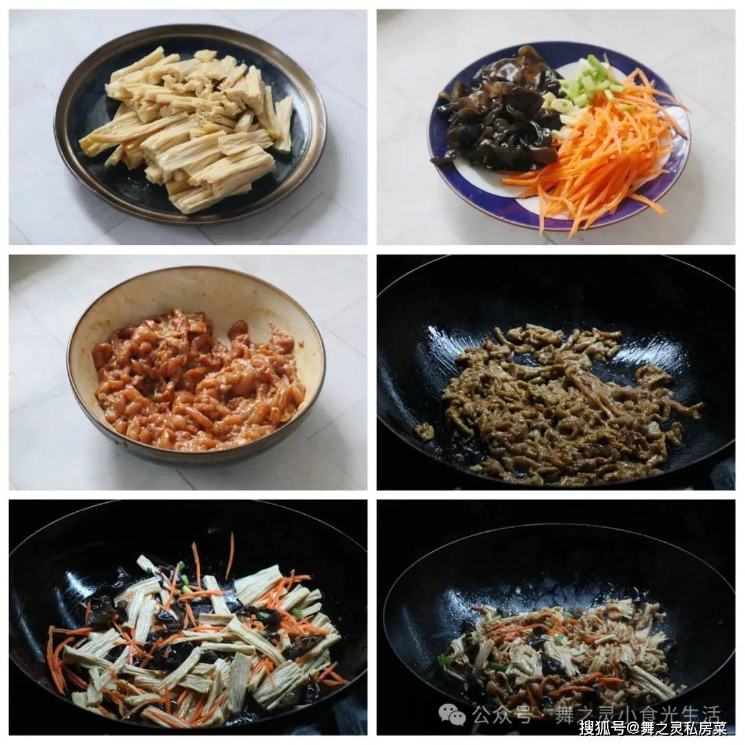 4、锅中倒入油爆香蒜蓉和葱白,然后再加入胡萝卜丝、腐竹和黑木耳一起翻炒。加入调料盐、少许蚝油、糖,还有水,等汁收了再把之前滑过的肉丝倒入大火翻炒入味,撒入香葱根据个人口味可以再加点鸡精之类,出锅就可以吃了。