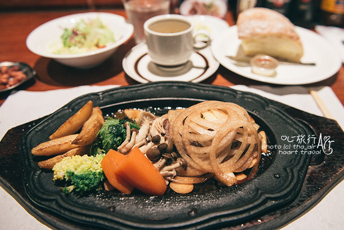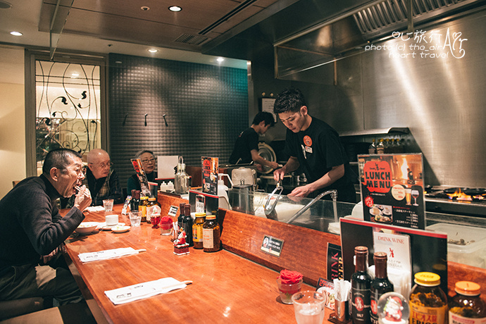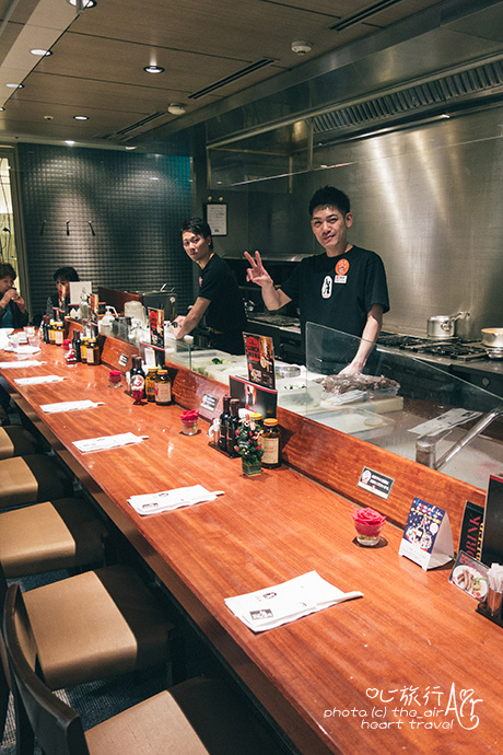 一直惦记着鹿儿岛的黑牛,于是选了一家做黑牛铁板烧的餐厅,早进去一步挑了操作台前的座位,后来出来的时候看到门口在排队。坐在操作台的好处是可以欣赏厨师的操作过程,很有气氛。