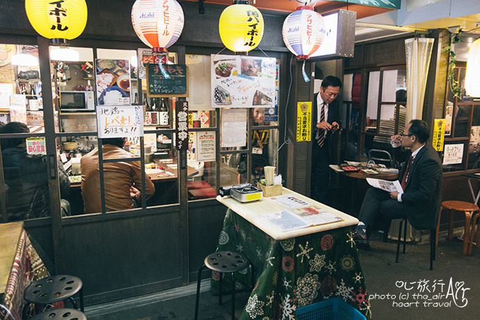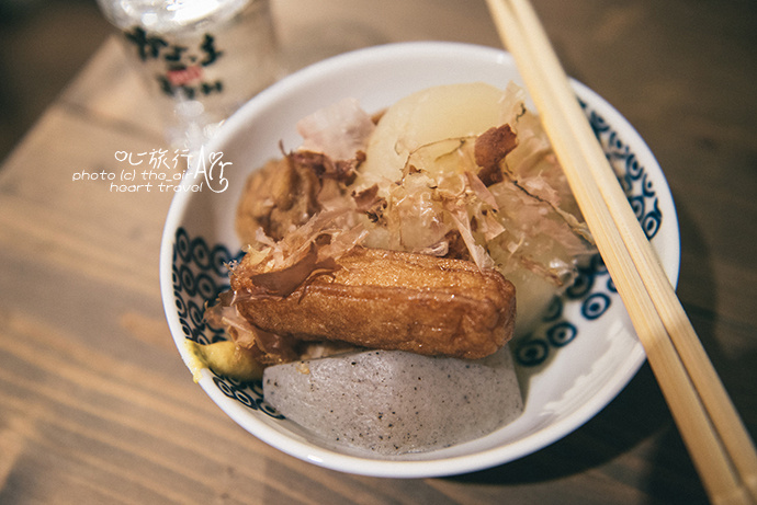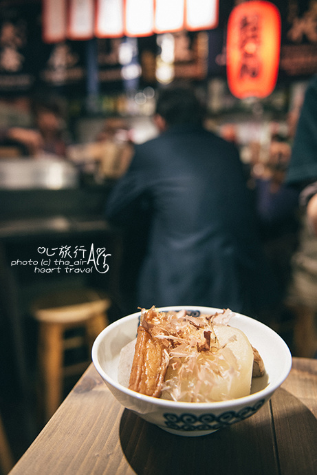 点了一碗关东煮下酒,红色的灯笼,坐在吧台的背影,组成了一副很日本的画面。