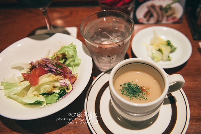 牛肉已经被切成厚片,要了五分熟,入口十分滑嫩。和普通的黑牛相比,和牛的口感要更加多汁细嫩,这是因为和牛中含有更多的脂肪。日本的和牛从高到低共分为五个等级,对和牛等级的判定有着严格的过程,从大理石的分布状况、肉质的颜色、松弛程度等都逐一进行评判,其中最重要的是看大理石的分布状况。这家店的和牛算不上高等级的,但味道已然相当不错,算是略窥和牛之一二吧。