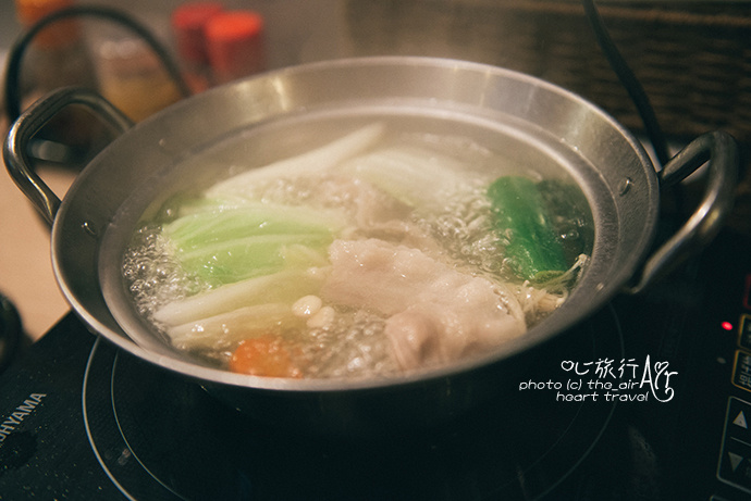 第二道是黑猪火锅。清汤做底,将肥瘦相间的黑猪肉片在汤里滚熟,再加入蘑菇和蔬菜,吃的时候蘸少许调味汁,猪肉本身的鲜味被发挥到淋漓尽致。而且肉片的口感非常柔嫩,久煮不老。煮过肉的汤完全没有浮沫,可见肉的干净,只是煮过几片猪肉,汤竟然变得十分鲜美,泡一碗白饭再好不过。最美味的食物永远不需要过分调味,只吃食材本身的鲜美!