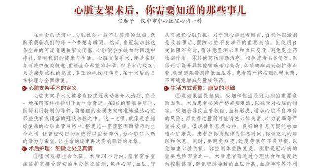 调整生活方式。手术后的恢复期,患者往往会面临需要改变生活方式的挑战。术后1到3个月,是身体适应支架、重新建立血管健康的重要阶段。