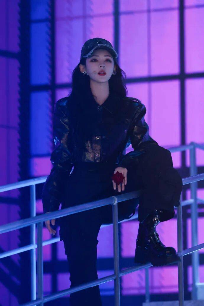 而在舞台上,她又摇身一变,成为了酷拽的黑色皮衣工装风女王。黑色皮衣,象征着力量与不羁;工装元素,则增添了一份干练与帅气。她穿着这套造型,站在舞台上,眼神坚定而犀利,仿佛整个世界都在她的掌控之中。她的每一个动作,都充满了力量感,让人感受到一种强烈的视觉冲击。这时的她,不再是那个清冷的电影女主角,也不是可爱的邻家女孩,而是一个充满霸气与自信的舞台王者。