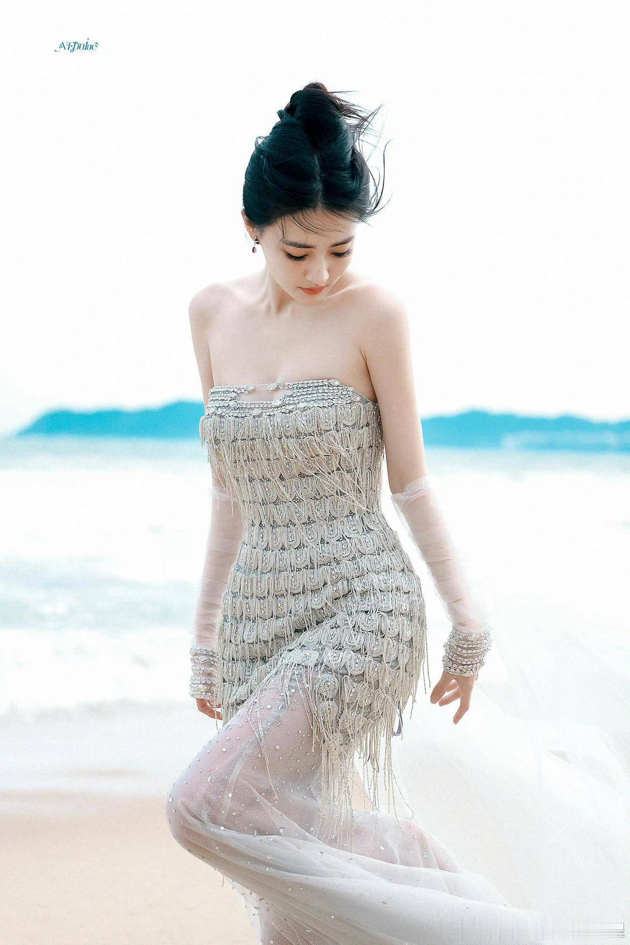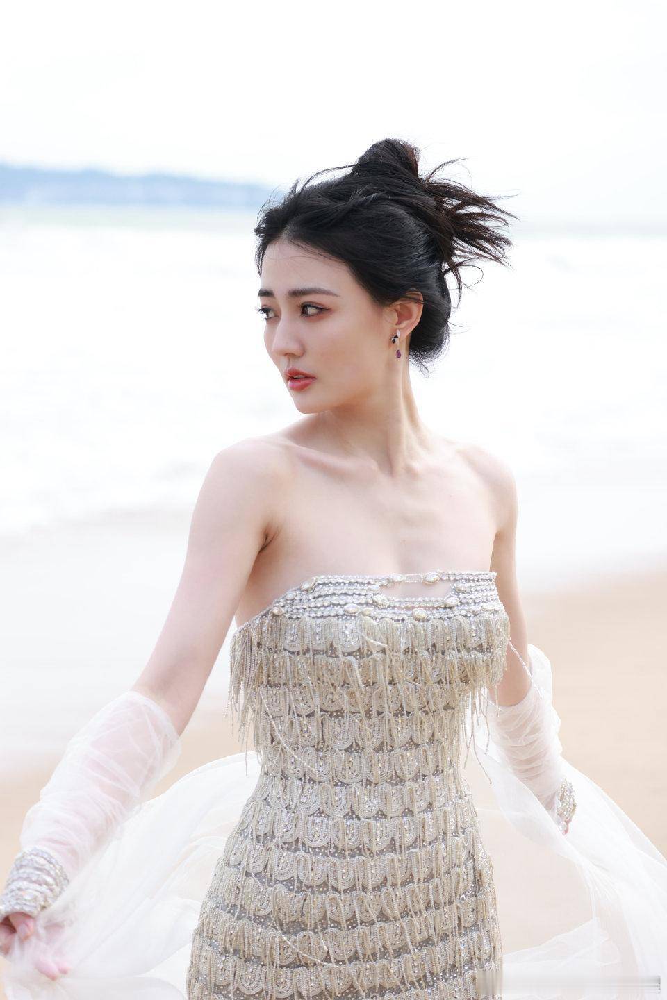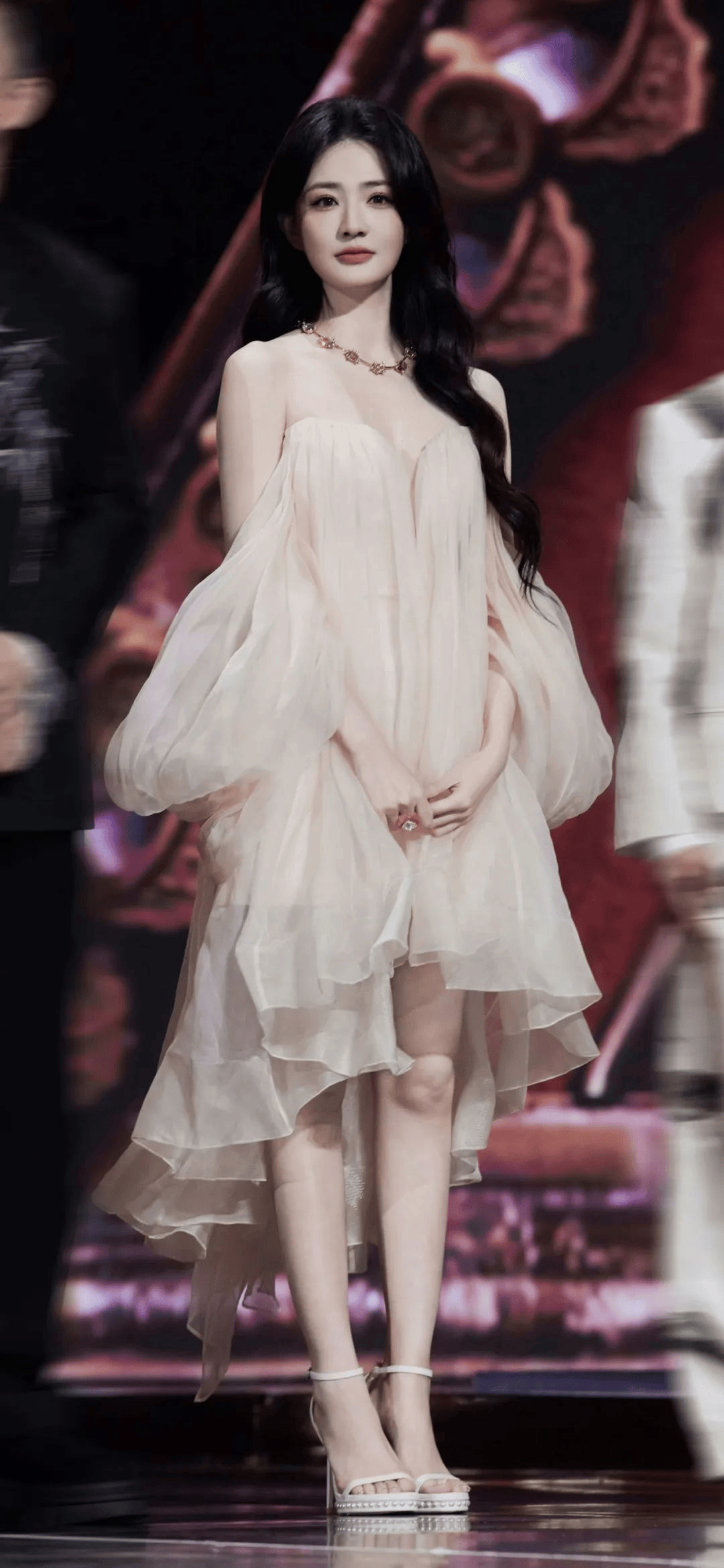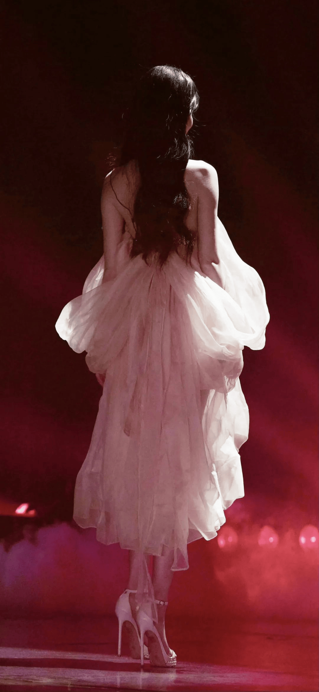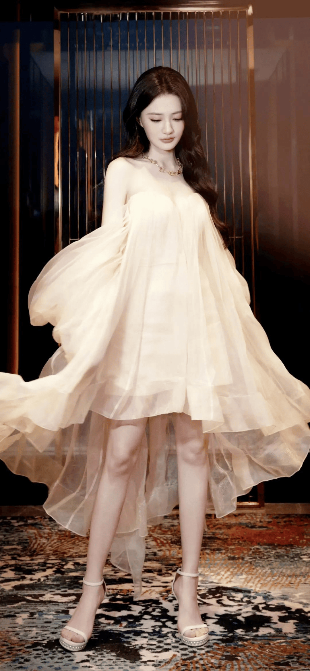 冷白肌肤在灯光下透出自然粉晕,搭配浅色系礼服时(如渐变粉晶鱼尾裙),腿部更显莹润如玉,营造“人间水蜜桃”的鲜活质感 。