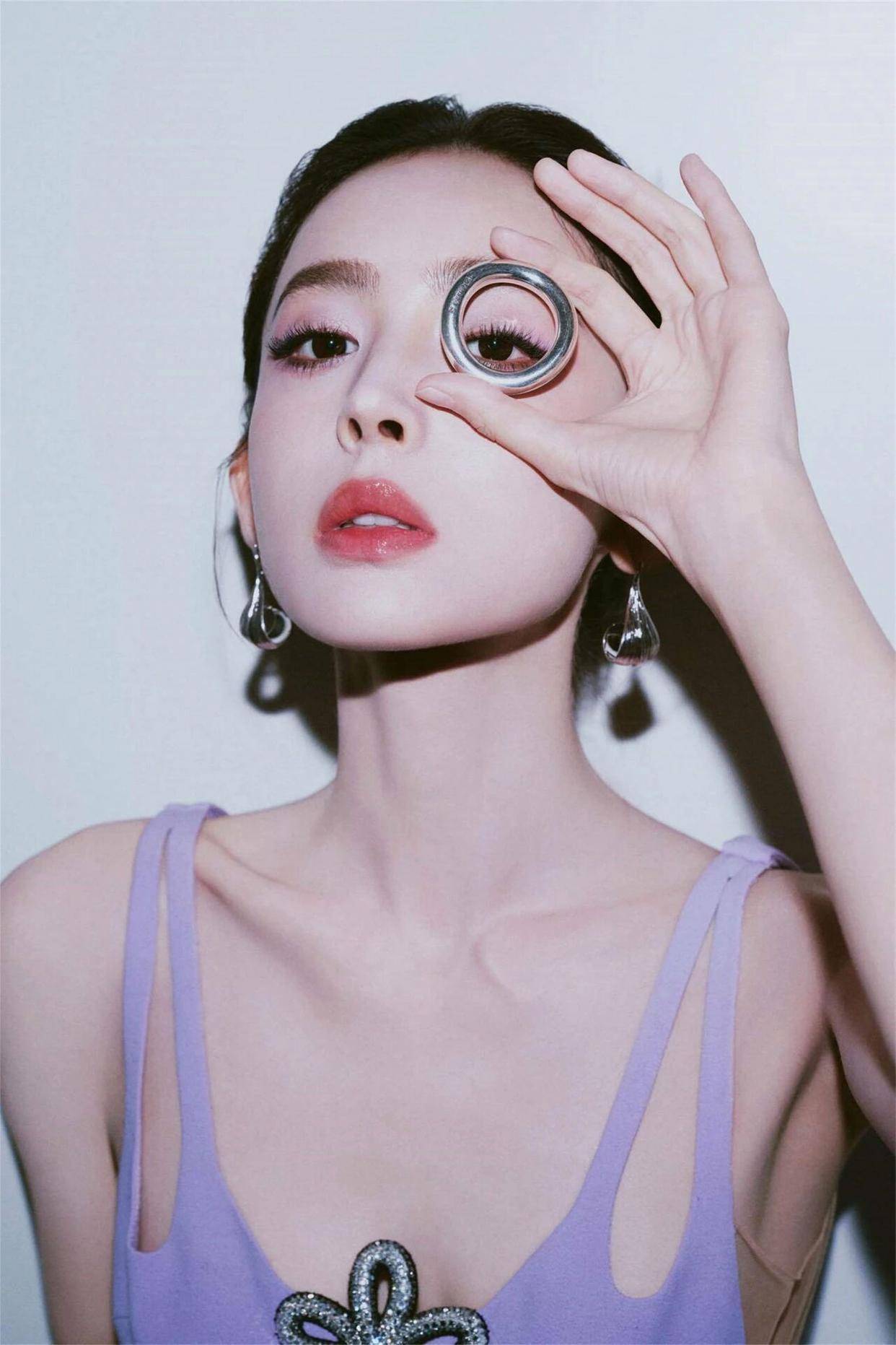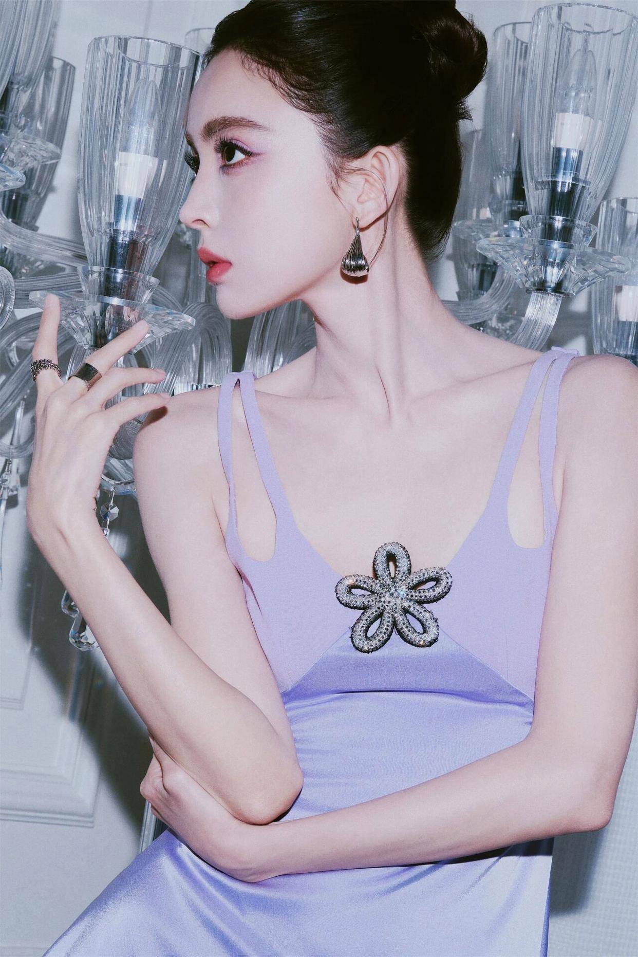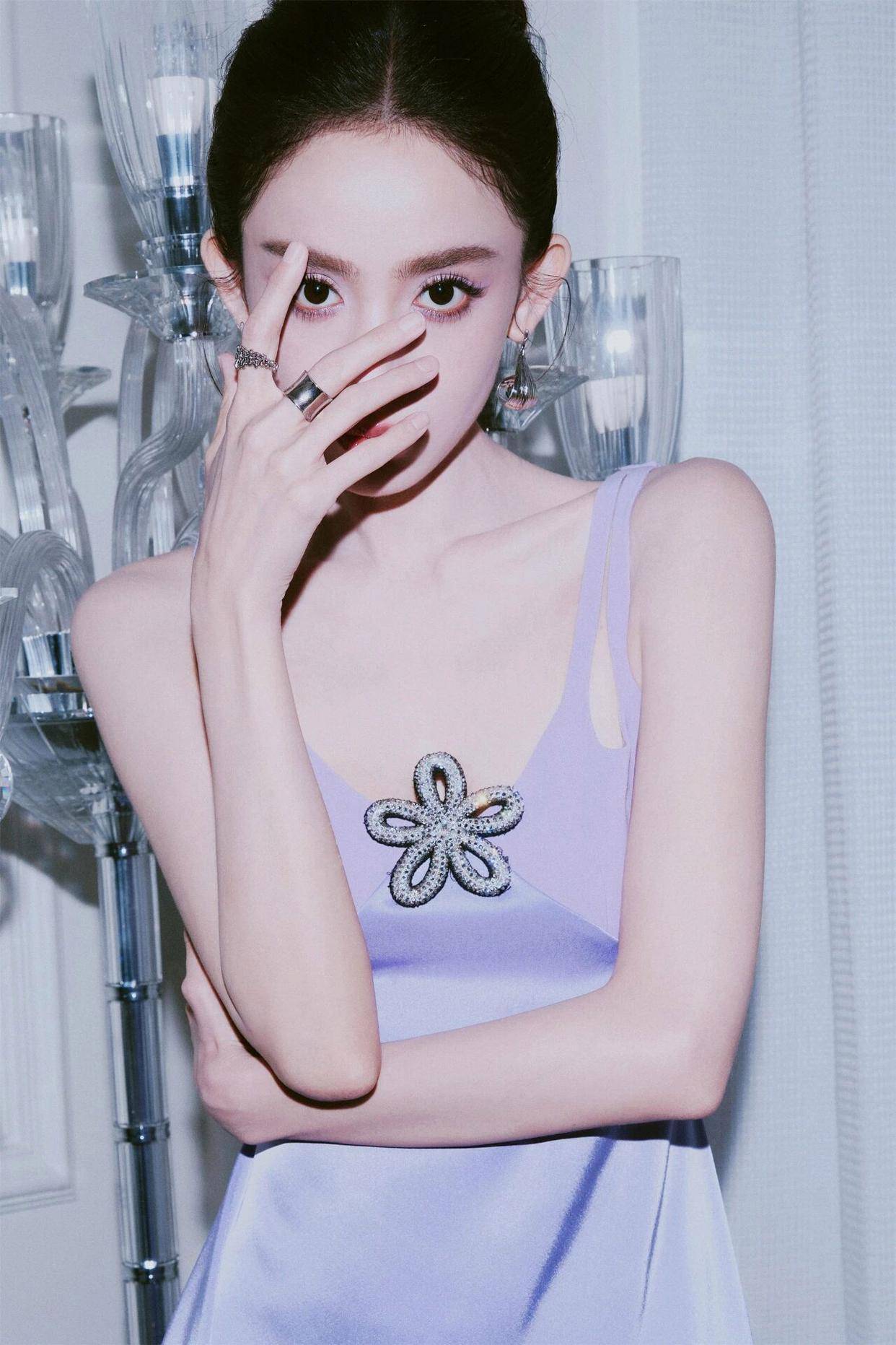 淡紫缎面裙的光泽质感衬托得她皮肤白得均匀透亮,如同上好的羊脂玉般在镜头下格外抢眼,即使近距离拍摄也依然保持着细腻的状态,这也是她一贯的颜值亮点。