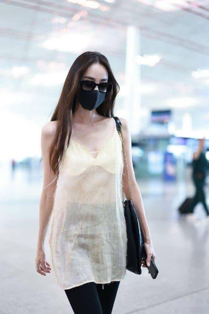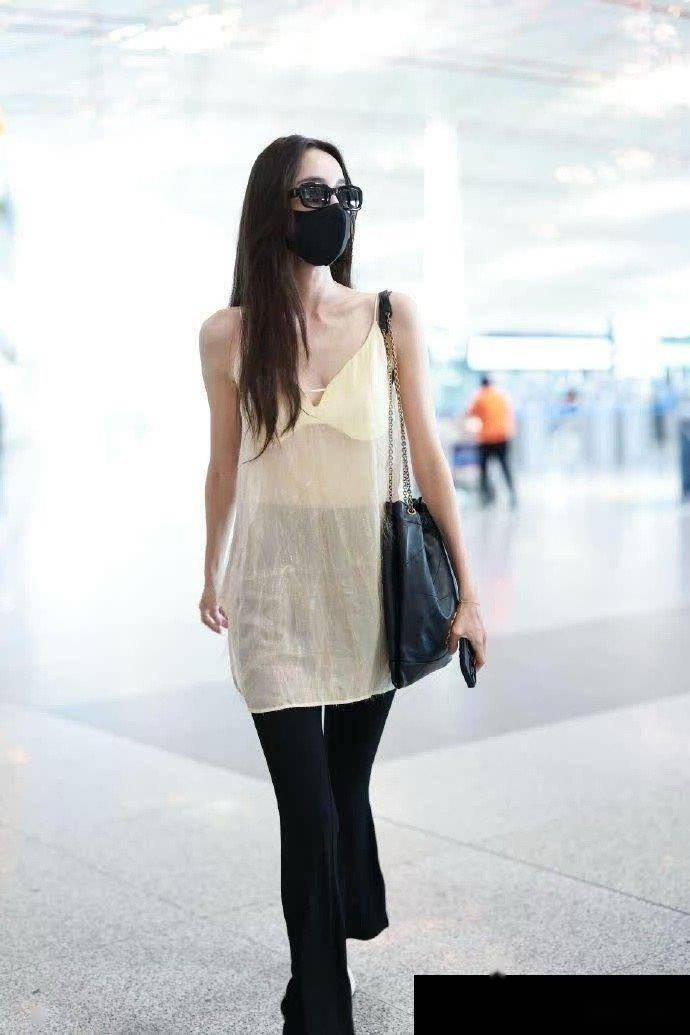 再看她的机场造型,一件淡黄色的透视吊带装,搭配黑色喇叭裤,风格又酷又性感。戴着墨镜和口罩,气场全开,有种 “生人勿近” 的时尚感。透视装的面料上还有细闪,在灯光下特别吸睛,即使是简单的机场穿搭,也被她穿出了时尚大片的感觉。这种大胆的穿搭风格,在当时的机场街拍中可不多见,也让大家看到了她在时尚穿搭上的勇气和品味。