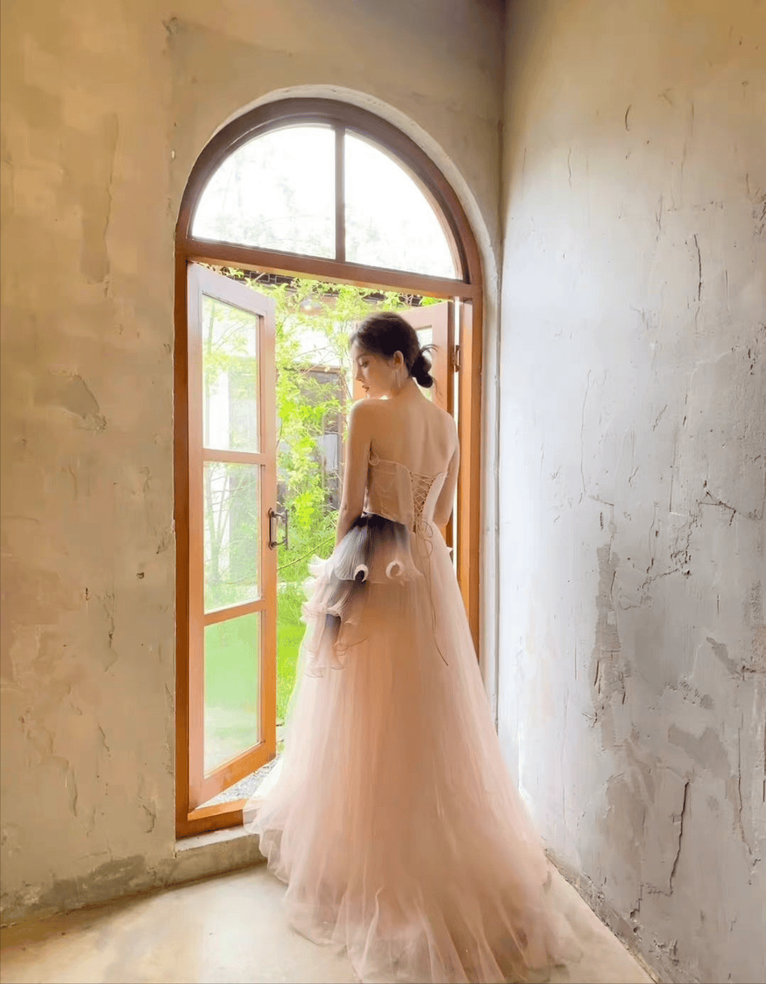 此外,这条礼服采用了渐变色的设计,从柔和的浅粉色过渡到神秘的深紫色,层次感十足,色彩的交织仿佛晚霞与夜幕交替的瞬间,既浪漫又别致。渐变的色调打破了单一色彩的沉闷,给整体造型增添了动感与灵气,避免了传统礼服的单调。