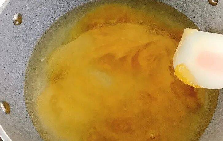 6、油要慢慢地加进去,倒一些炒到吸收之后,再倒入一些再继续炒,只有加了油,牛皮糖才不会那么容易变硬。