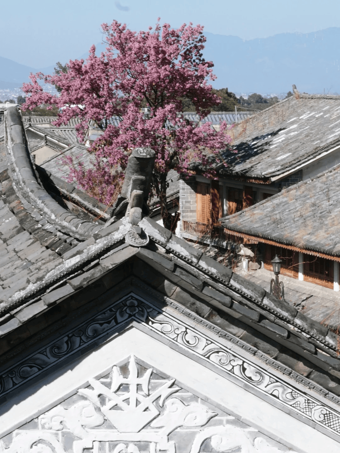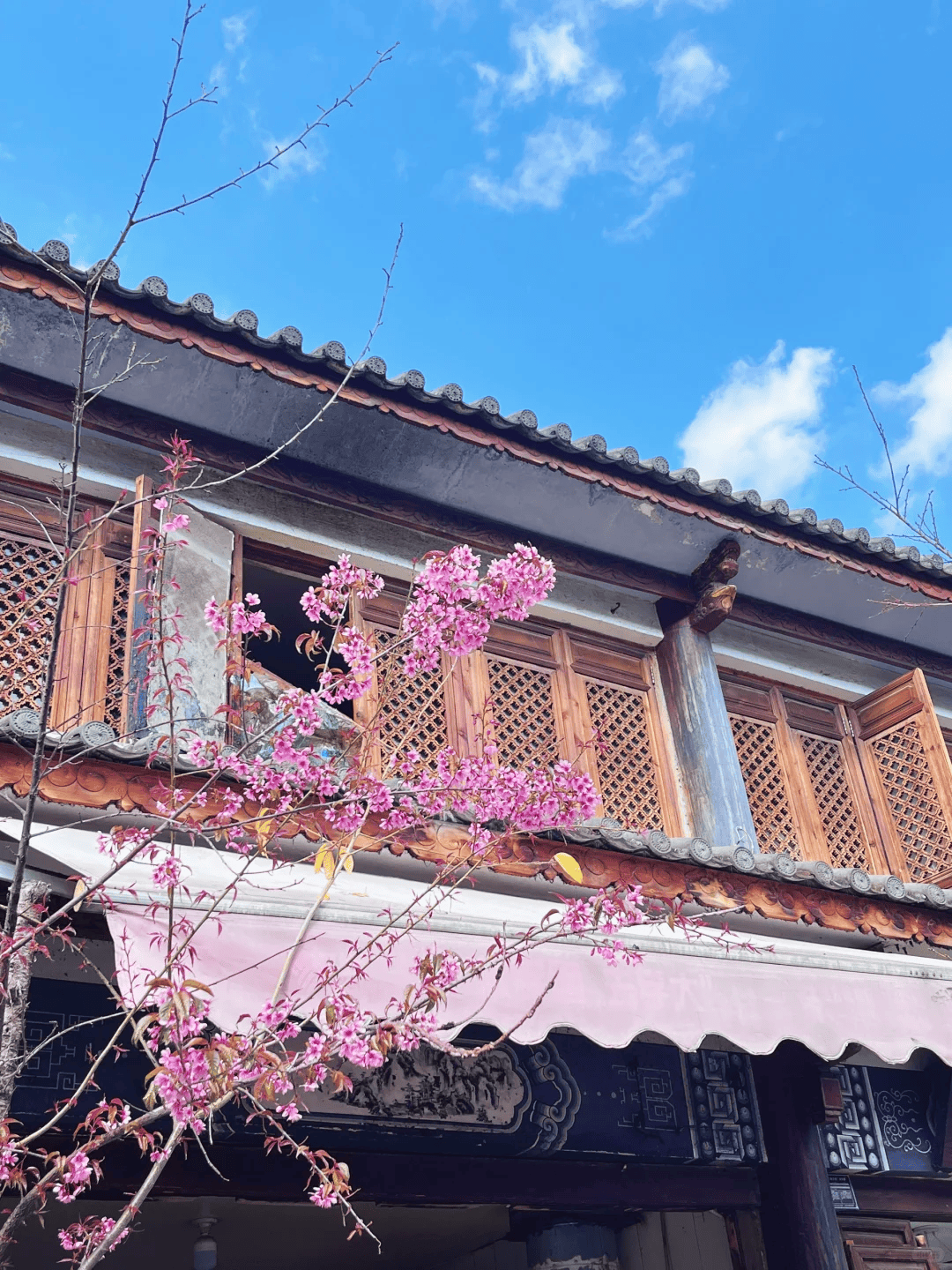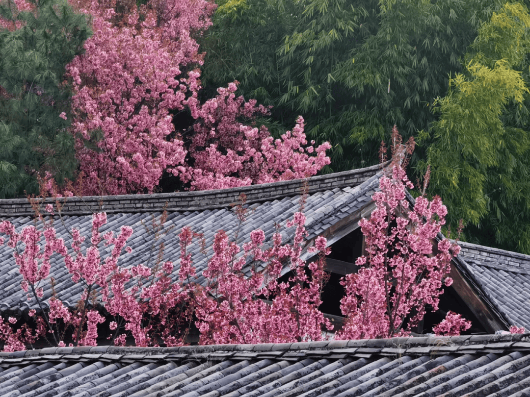 在五华楼,在博爱路,在复兴路,在叶榆路,三三两两的花枝横斜,掩映着古色古香的屋檐,忍不住就慢下了步伐。