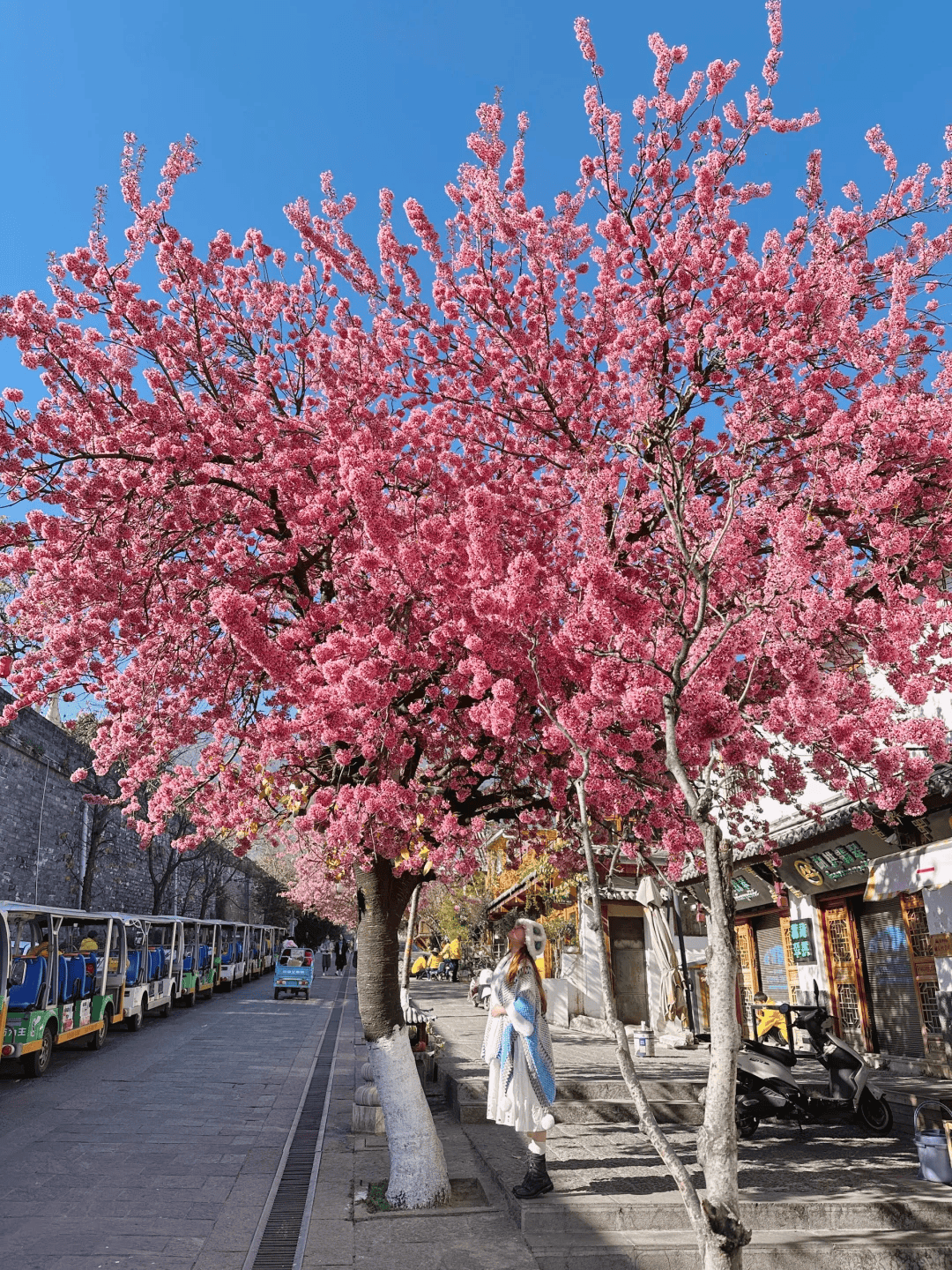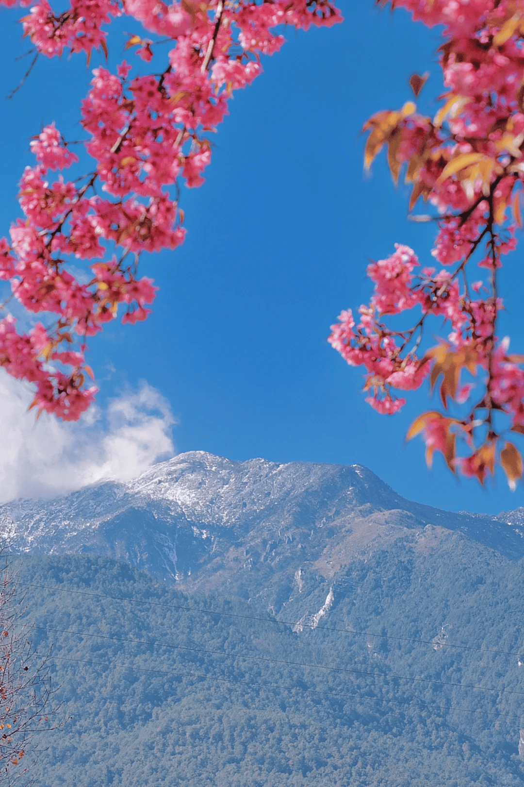 有红透了的水杉树,也有盛开的冬樱花,还有洁白的雪山,仿佛同时拥有了春秋冬。