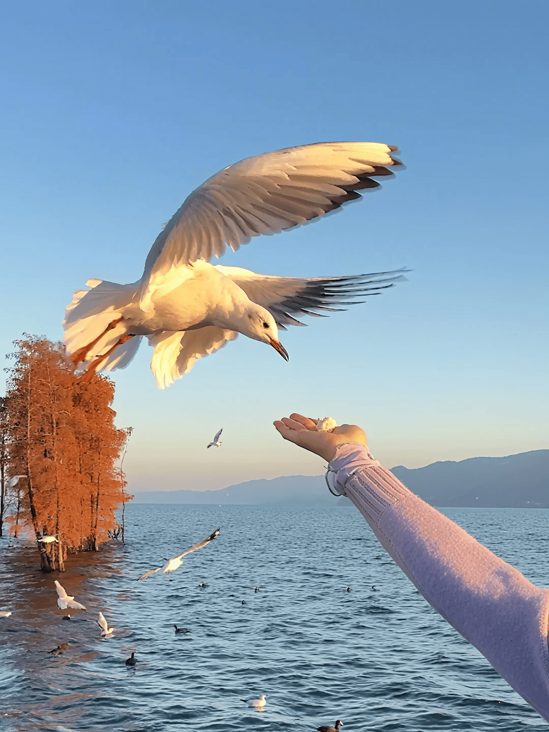 欣赏风光之余,如果你想和海鸥亲密互动,一定要选在日出或日落的时候,海鸥超级亲人,但中午的海鸥就比较懒一些。