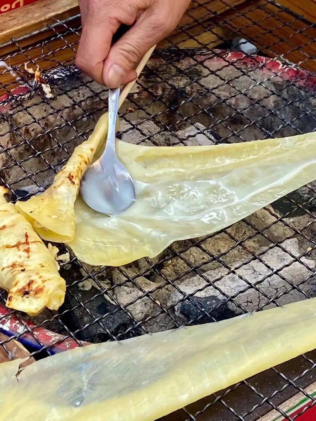烤好的乳扇最简单的吃法就是蘸点清甜的土蜂蜜,但在街头巷尾的小摊上,经常会被刷些玫瑰糖浆或是辣椒酱,卷一卷直接吃。