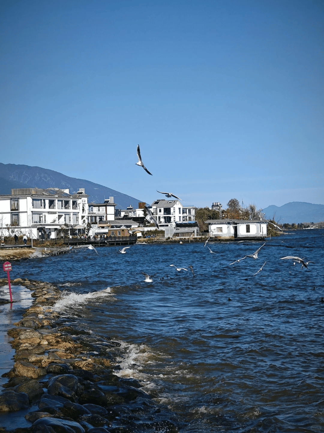 驻足在洱海边,聆听着海鸥阵阵清脆的鸣叫,目睹着阳光下闪着金光的层层水纹。