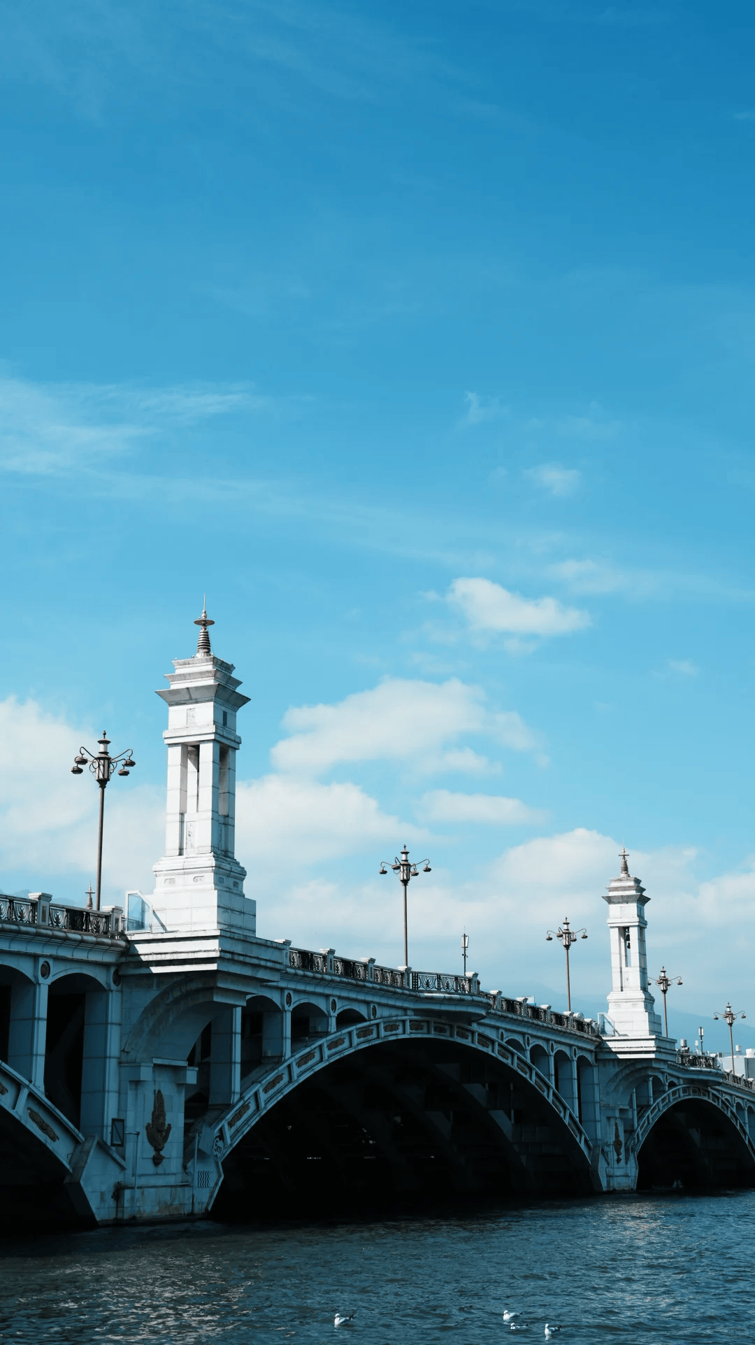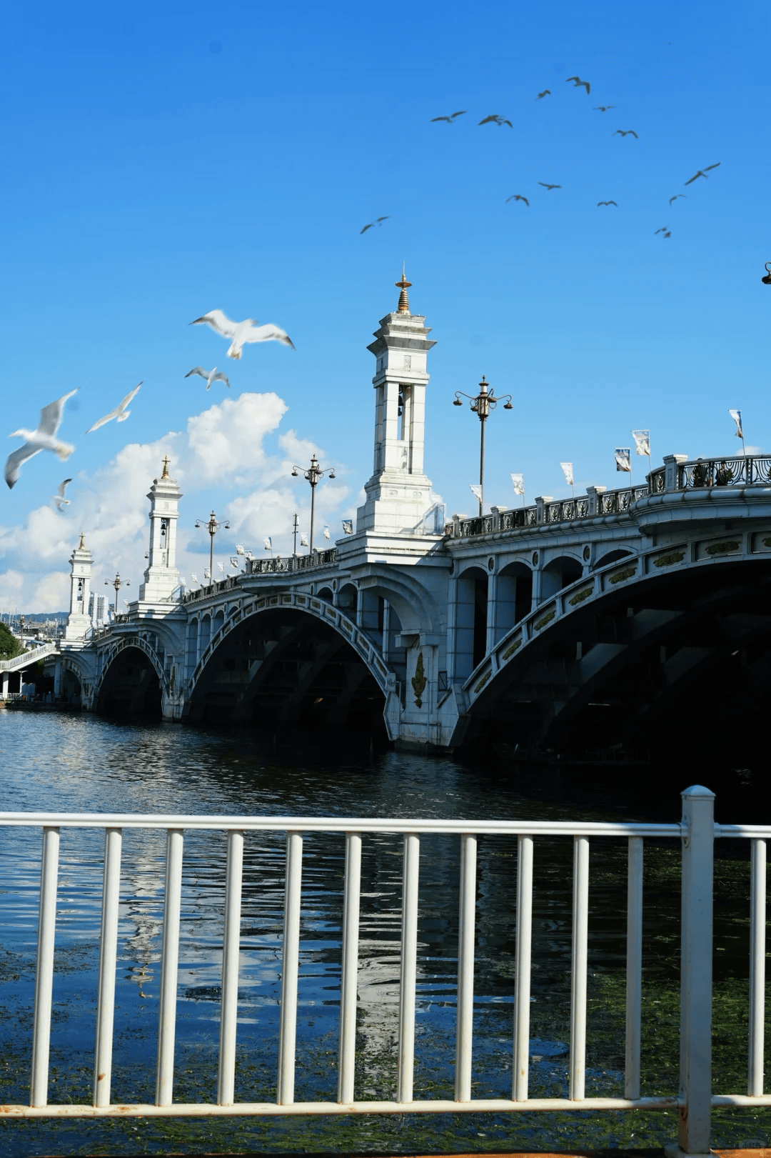 干净的白色桥身在夕阳的剪影下流光异彩,桥下的水流随风荡漾,海鸥成群地低空翱翔,里里外外都透漏着欧式风情。