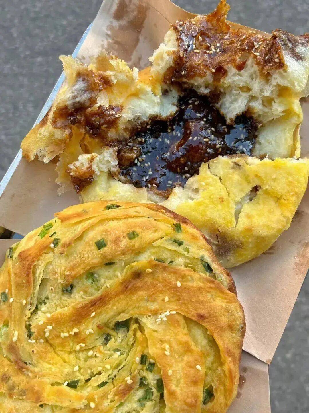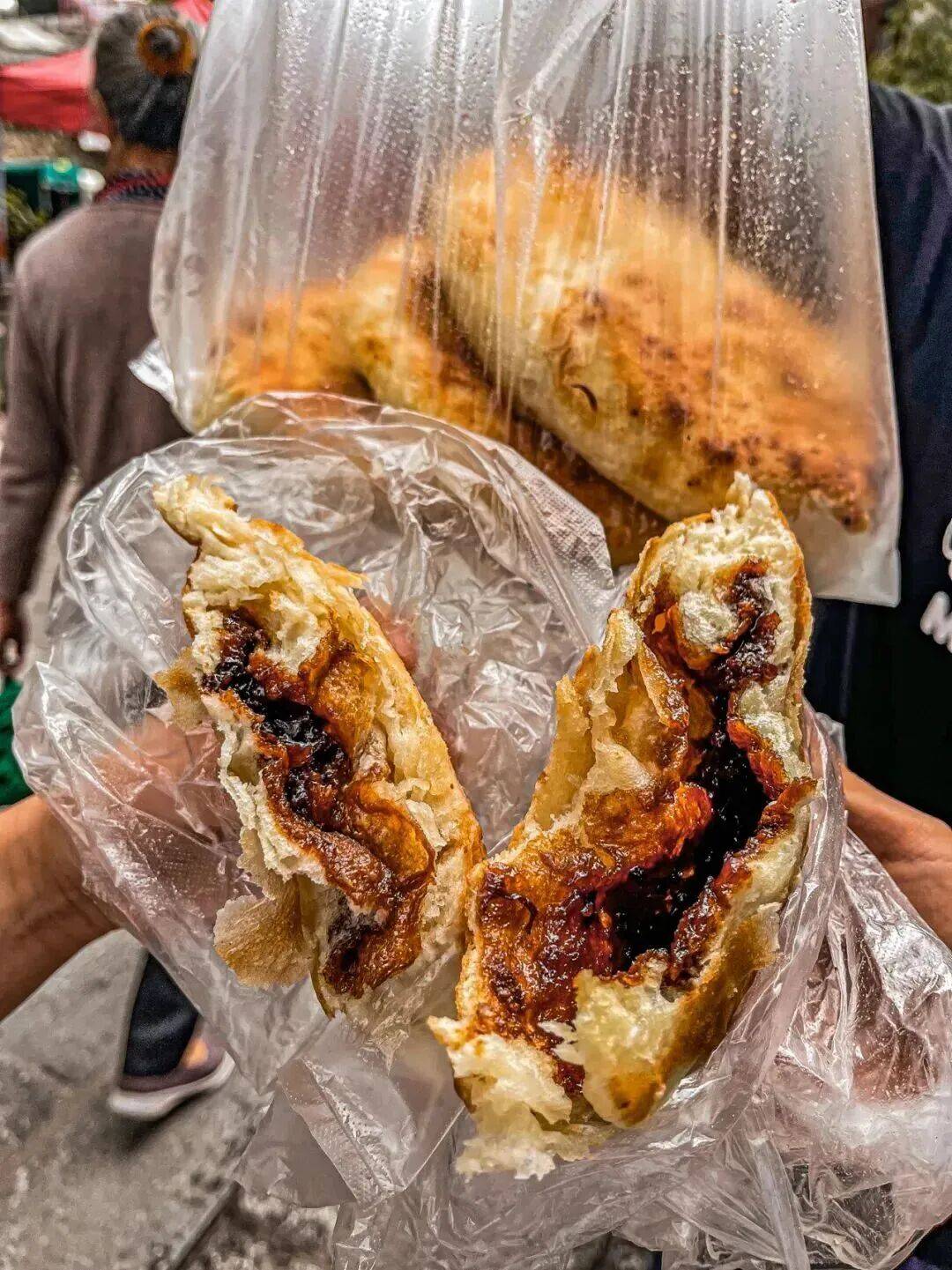 一口咬下去外皮酥酥的微微爆汁,紧接着就是绵实的糕点口感混杂着肉沫的香气,松软无比;红糖味的更是可口快意,别有一番风味。
