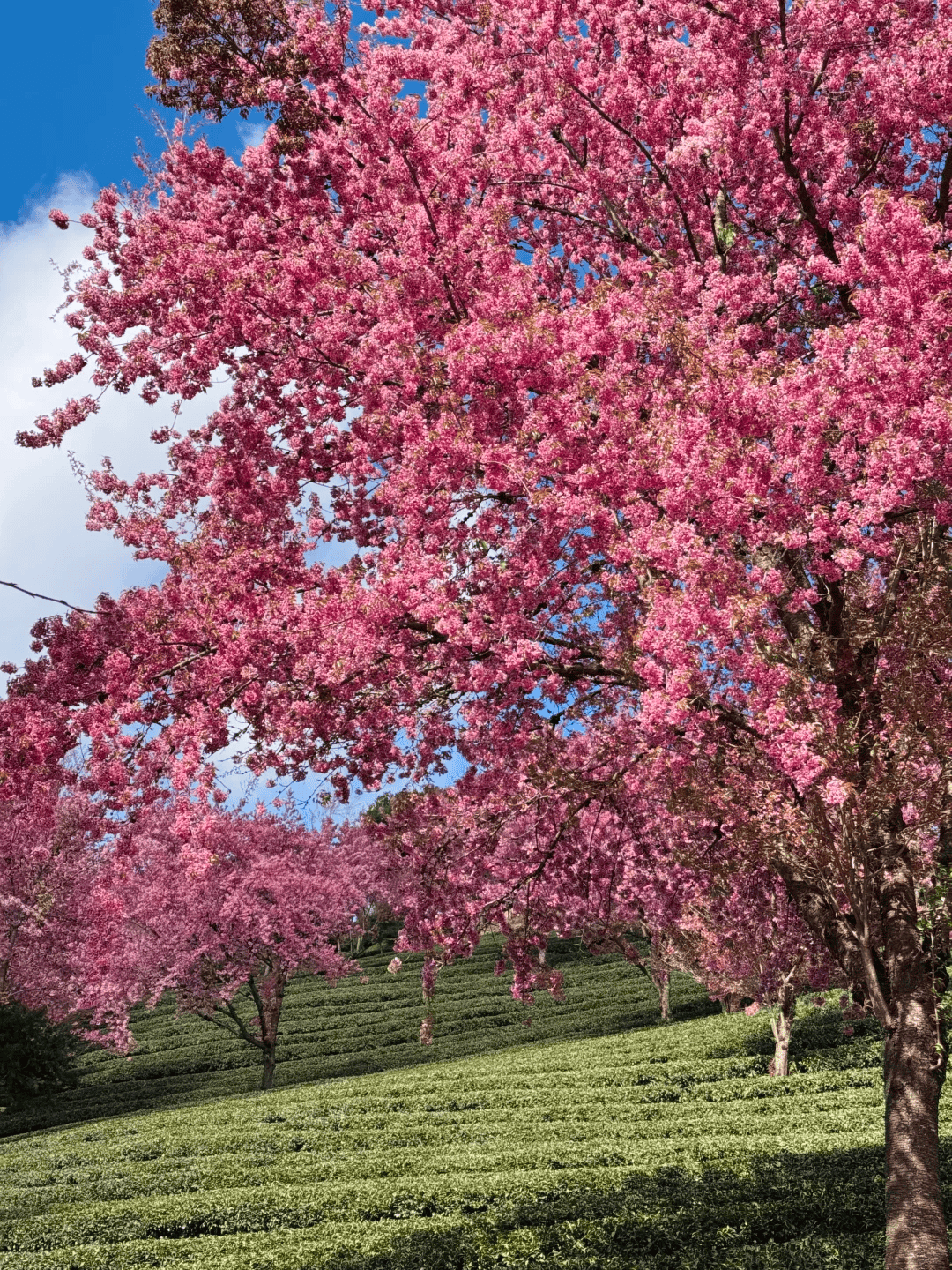大片大片的樱花,开满了整个山头,苍翠欲滴的茶田,在肆意地滋长,偶有一阵风起,就吹落一场簌簌落下的花雨,像是一脚踏入了童话世界。