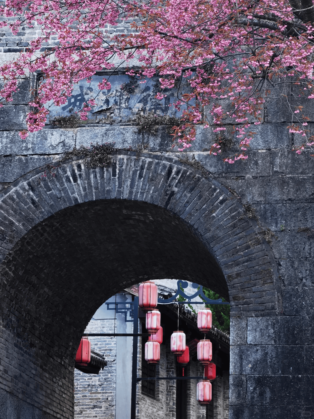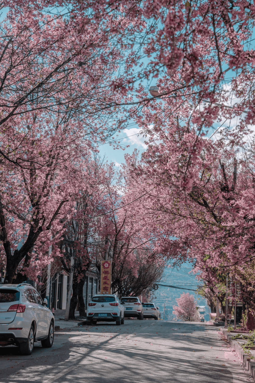 不经意间,街角、屋檐、古城墙,乃至路过的行人的发间,都会被一波又一波的粉色汹涌花海淹没。