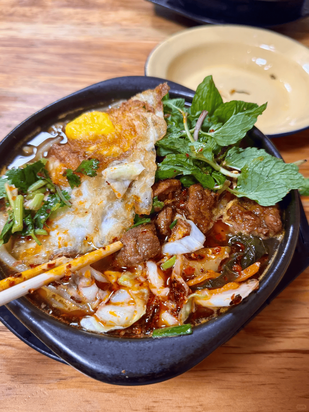 软硬适中的白色米线中,加入了芥兰菜,甜咸酸辣的复合味道,平衡又丰富。