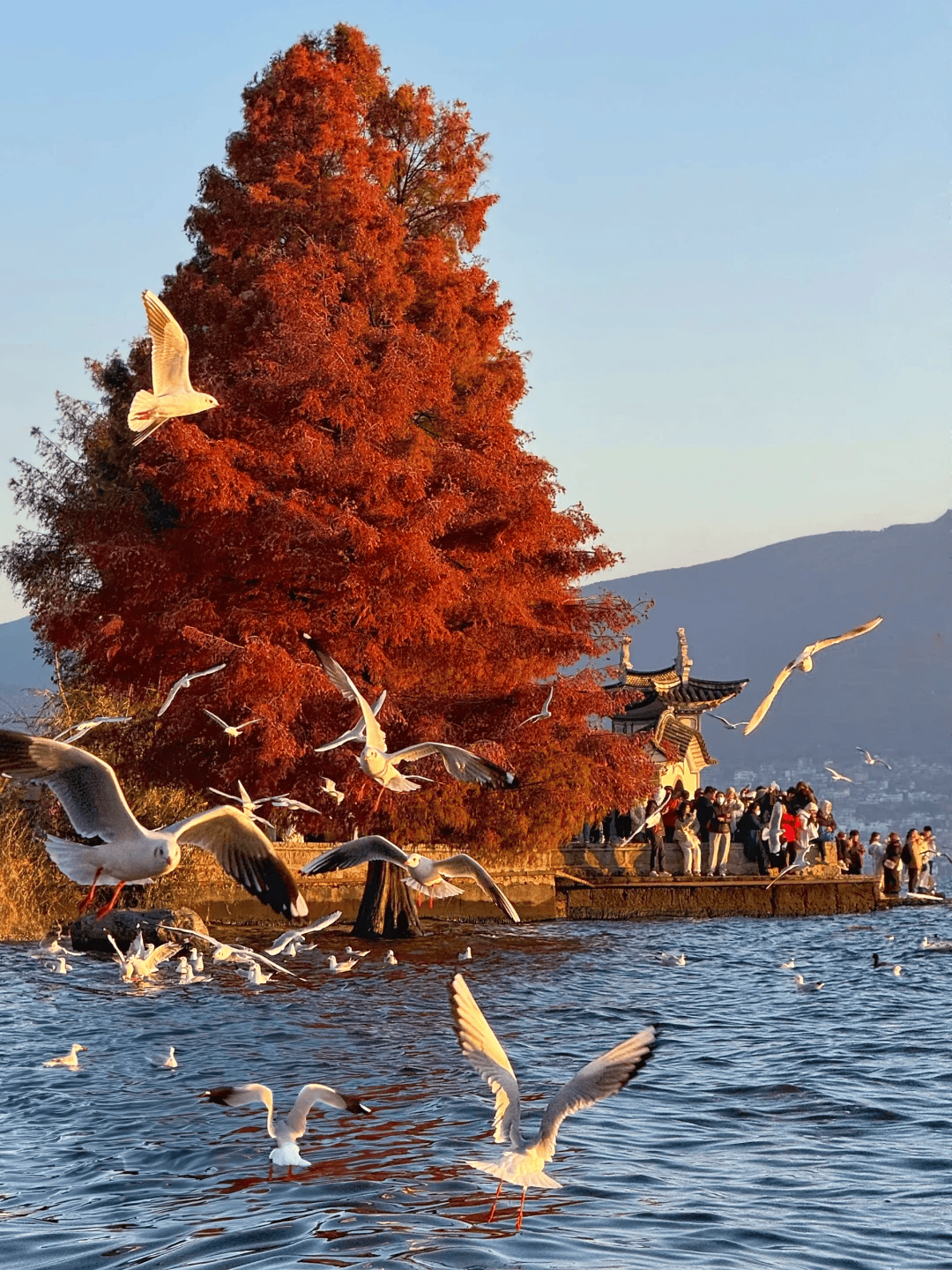 每年这个时候,来自西伯利亚的海鸥,还会来到大理过冬。洱海边,总有一群群拍照的人,看着海鸥盘旋飞舞。