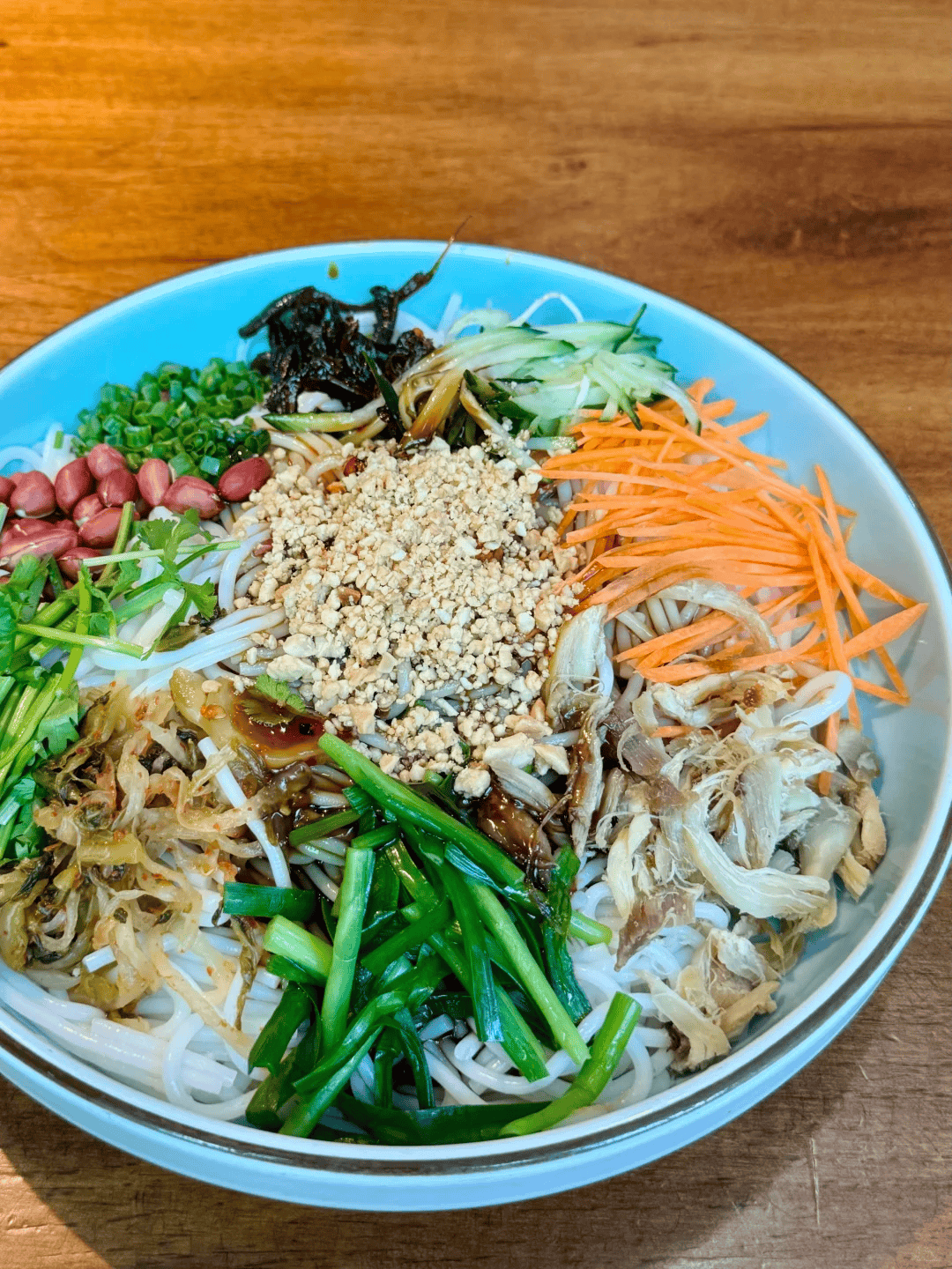 猪鸡丝香香的,根根分明,弹润润的米线是大口可吞的细腻顺滑,再加上花生碎浓郁的香味,开胃又一绝,光想想都忍不住咽口水。
