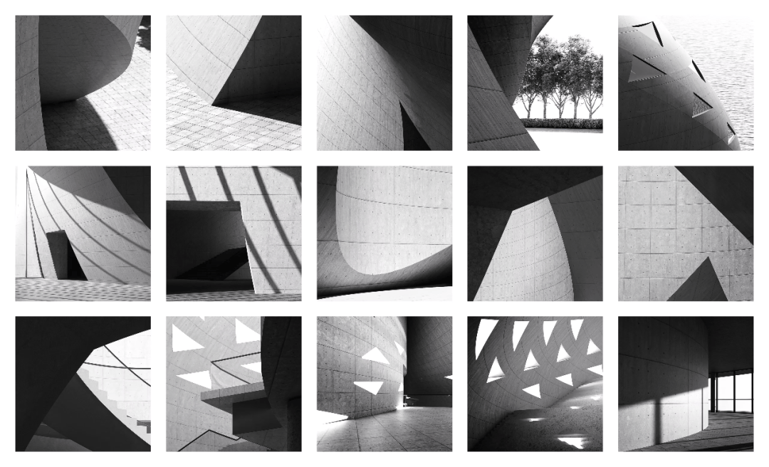 建筑采用安藤忠雄标志性的清水混凝土,这种材料以其纯粹、质朴的特性,与迪拜强烈的阳光和开阔的海湾环境形成鲜明对比。光滑的白色面板覆盖立面,搭配精心设计的三角形开口,实现了光线的精确引导和视觉上的节奏感。