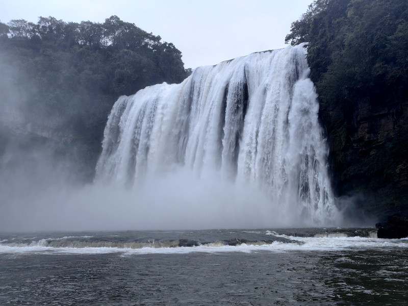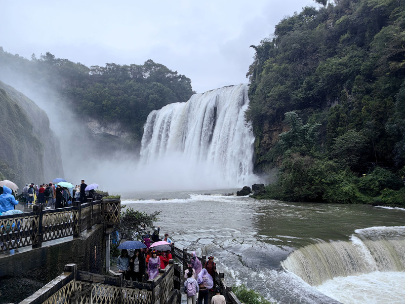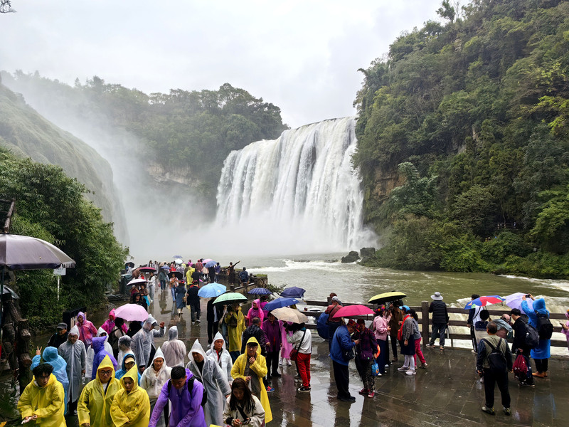 第二站:大瀑布,进入景区步行至盆景园,走左边路线,是步行下山,据说能欣赏到各个观景点,走到谷底欣赏黄果树瀑布。另一路线是可以乘坐大扶梯(建议去时徒步,步行下山约20分钟,回时坐扶梯)。我们乘扶梯下行,沿河边行走,不久就到达大瀑布了,此处有观景台,近距离感受大瀑布的震撼。因为临近瀑布,气势磅礴的大瀑布落下,激起非常大的水汽,最好穿上雨衣。向上走会看到一些人继续前行,那是前往水帘洞,从大瀑布后面走过,瀑布犹如泼水,气势不凡。继续沿原路返回,乘扶梯上行回到景区口。