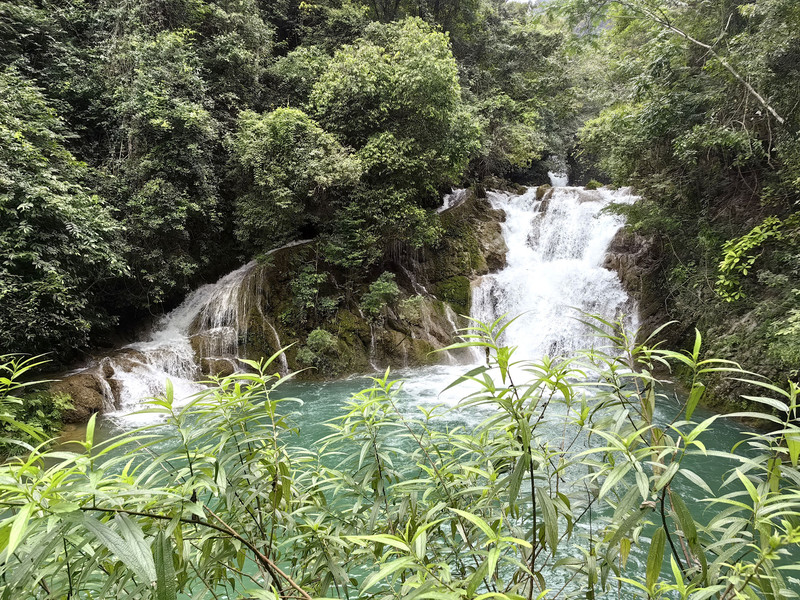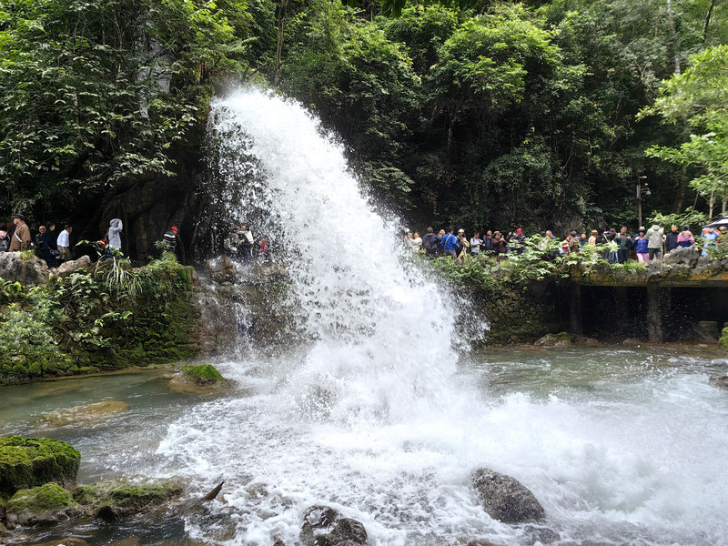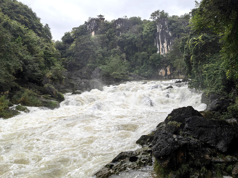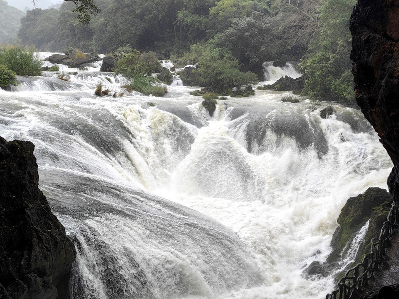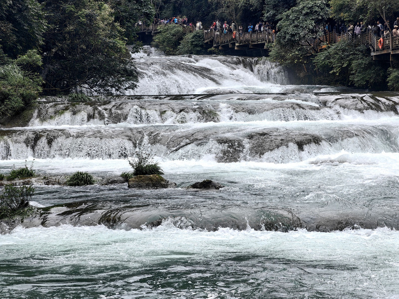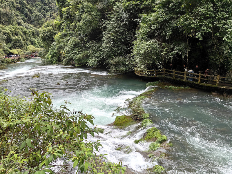 出天星洞后下行,在湍急的河水边行进,不久就来到银链坠谭瀑布。这个瀑布不是从上边垂直下落,而是较为宽阔的水从一些大圆石头上奔流收窄下落,集中到一处较窄地段,犹如玉珠落盘,此处水汽较大。从这里再前行一段不短的上上下下的石阶路,来到景区出口,有两趟观光车,分别前往黄果树瀑布和陡坡塘(攻略上说,从银链坠谭瀑布出来有索道通景区口,我没看到)。