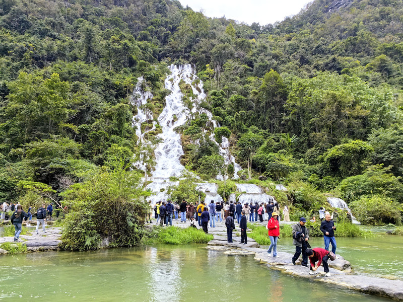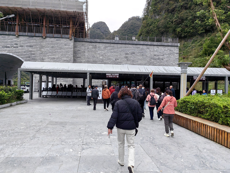 黄果树瀑布景区包括大瀑布、天星桥和陡坡塘三处景点,距离较远,需乘观光车。景区门票(含观光车、黄果树瀑布上下扶梯)270元/人,需要提前预约。进入景区大门后,我们按天星桥-大瀑布-陡坡塘顺序游览。进入黄果树景区大门后,按照景区不同,分三处排队乘观光车。我们首先乘观光车前往天星桥。