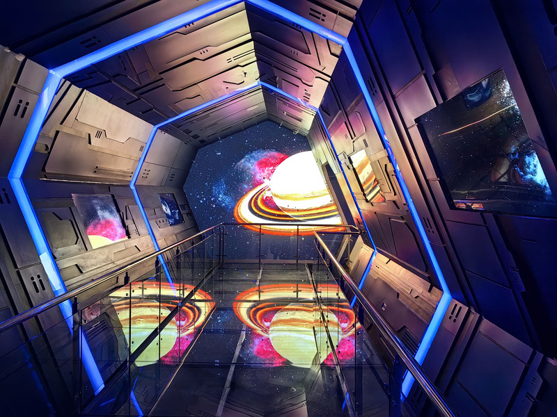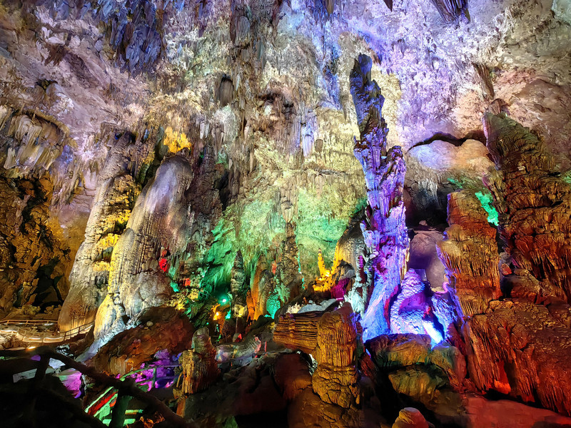 天星洞外面看不大,能容一人前行,地面湿滑,走一段后,豁然开朗,套着一个大洞,目测有十米二十几米高,打着各色灯光,光怪陆离。