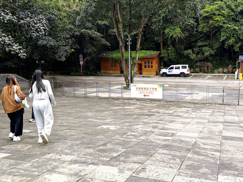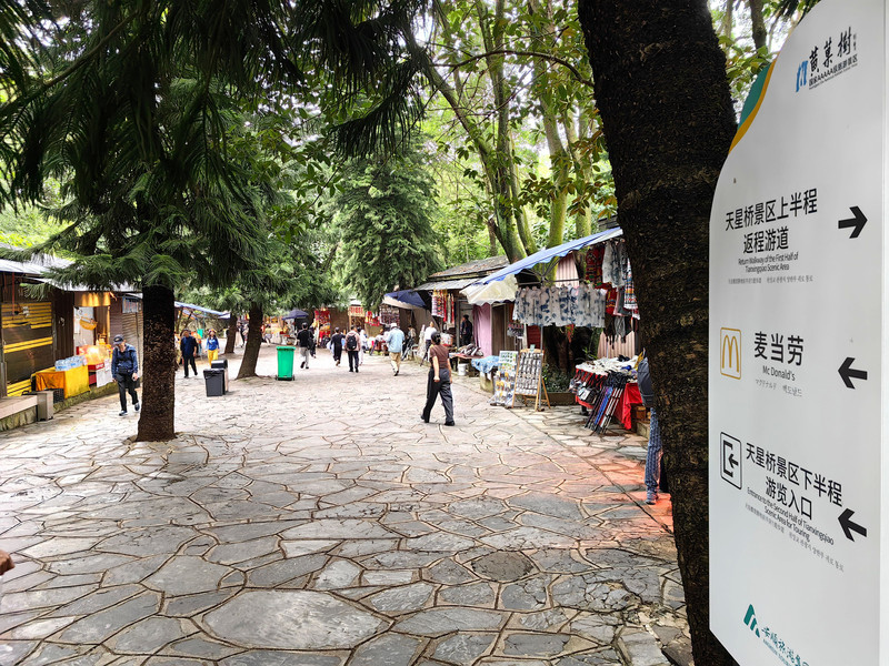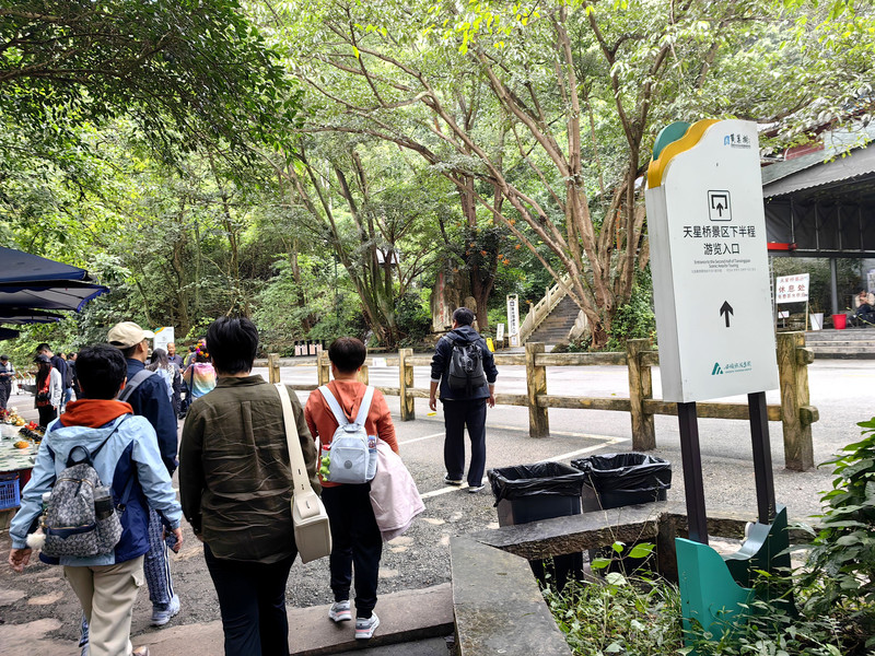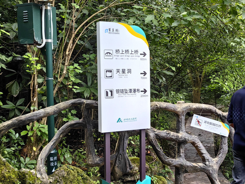 不用犹豫,上到二层后,会有工作人员指导刷身份证入园。入闸后前行左转,这里可以看见天星桥景区下半程指示牌,跟着指示牌走就行。路过一个小瀑布和水潭,