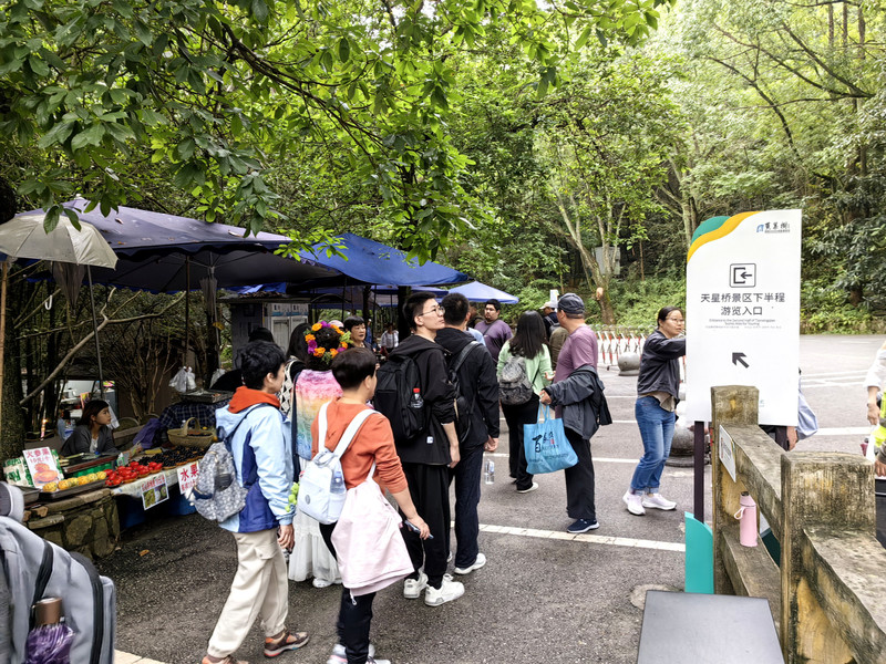 沿着公路走(在护栏内走),看见天星桥景区下半程游览入口指示牌,看到几个水果摊,继续直行。