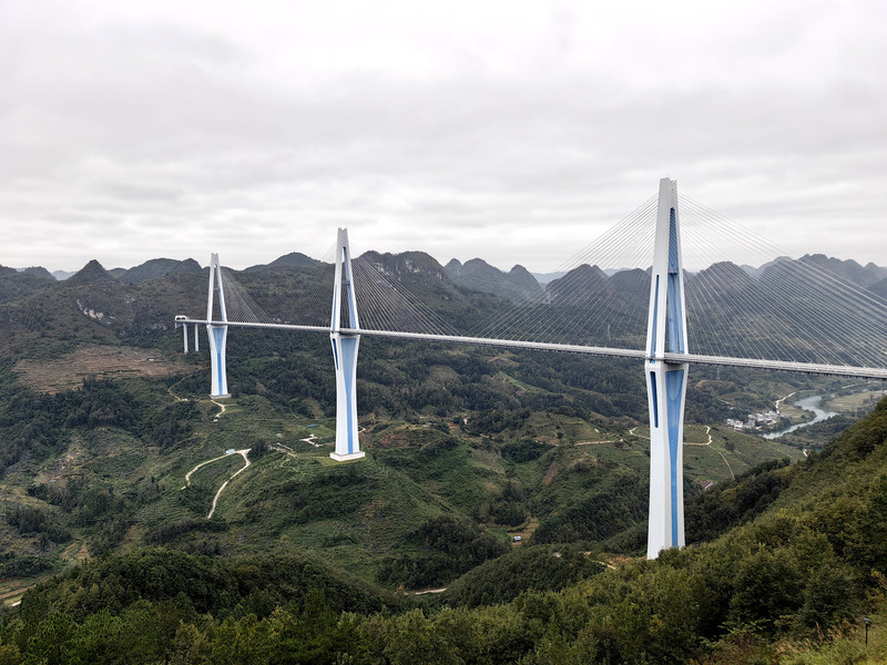 按照计划我们乘车前往坝陵河大桥观赏,行驶约20分钟(12公里)。坝陵河大桥是安顺市境内高速通道,位于坝陵河上,是上海—昆明高速公路重要组成部分。线路全长2237米,主桥长1088米,高370米。东塔塔身高185米,西塔塔身高201米,是世界首座山区跨峡谷千米级跨径桥梁。
